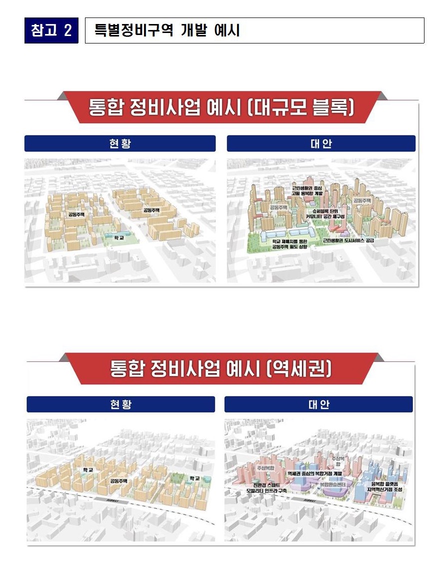 : 예) 간선도로로 둘러쌓인 1개의 블록 등 특별정비구역 최소기준은 시행령과 기본방침에서 구체화 → 4개의 아파트 단지 복합 개발 + 자족시설 확보 시 4개 단지를 1개의 특별정비구역으로 지정