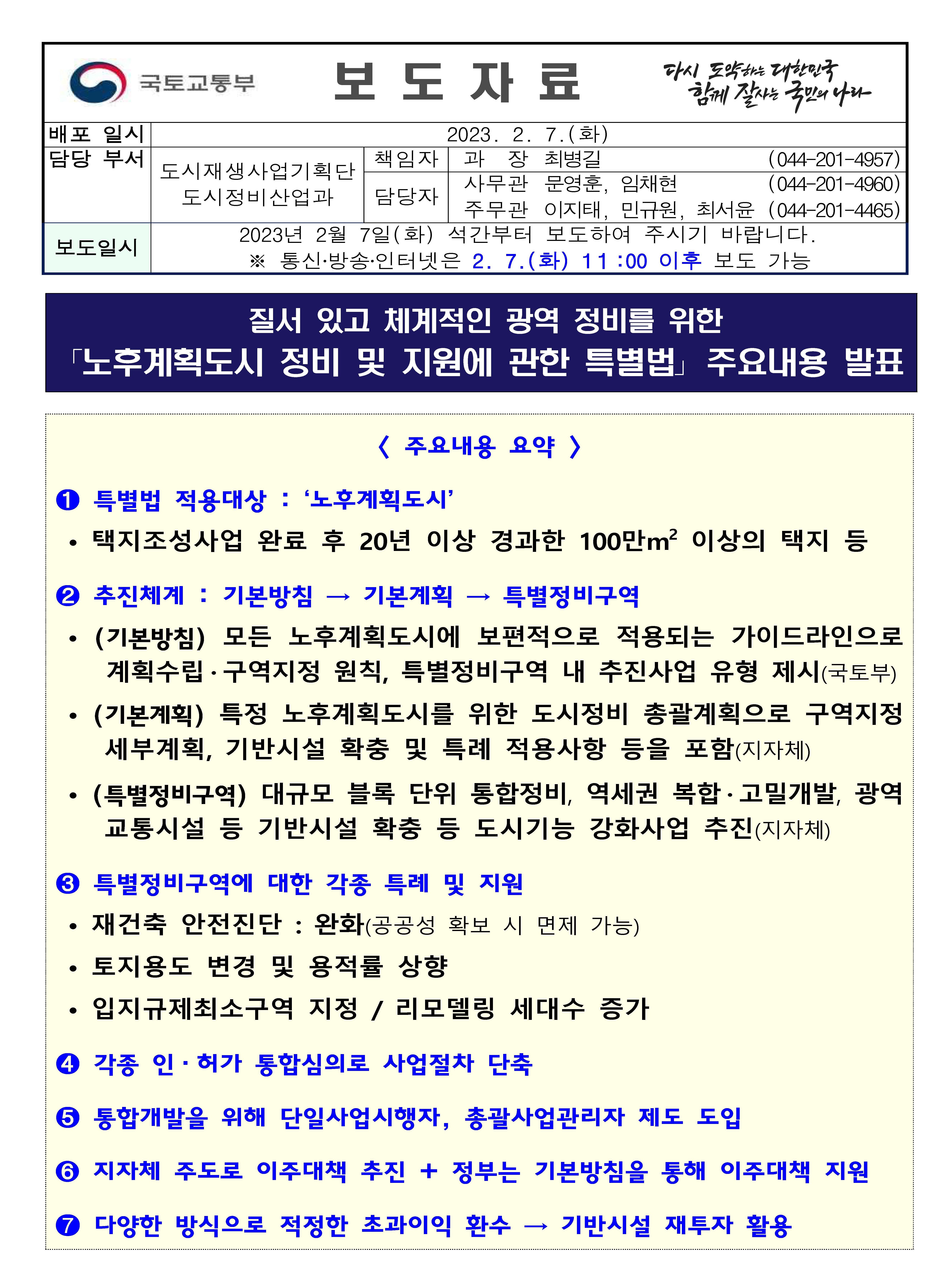 이를 토대로 계획 도시의 특수성을 고려하여 도시 차원의 체계적이고 광역적인 정비와 미래도시로의 전환이 속도감 있고 질서 있게 추진될 수 있도록 특별법의 주요 내용 확정됨