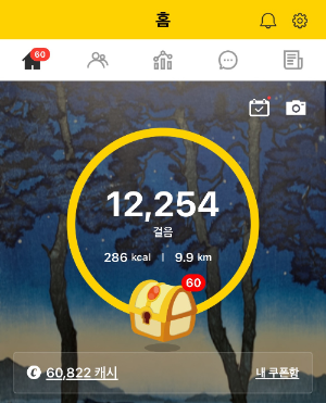 아래와 같이 오후 4시 반 기준. 오늘 걸은 걸음수는 12,254보. 저녁때까지 걸으면 더 걸음수가 추가되겠지만 10,000보까지만 금액을 보상해 준다. 100보당 1 캐시를 주기 때문에 10,000보까지 최대 100 캐시를 준다.