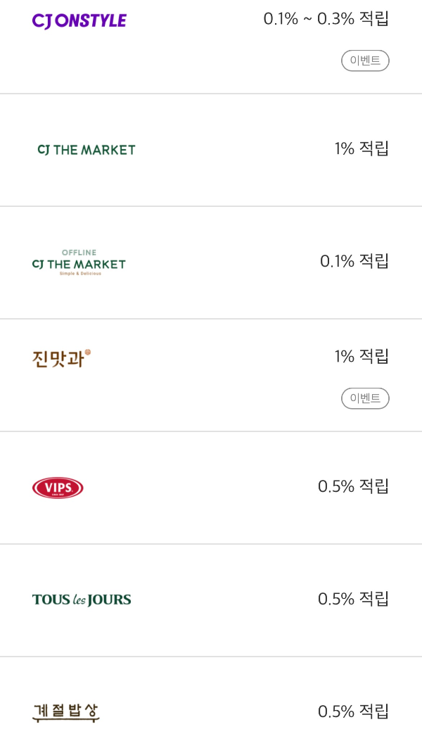 엔터테인먼트, 쇼핑, 외식, 유통분야에서 두각을 나타내고 있고 관련 브랜드는 아래와 같은데 각각의 브랜드에서도 모으고 사용할 수 있는 포인트들의 집결소가 CJ ONE 앱이라 볼 수 있다.