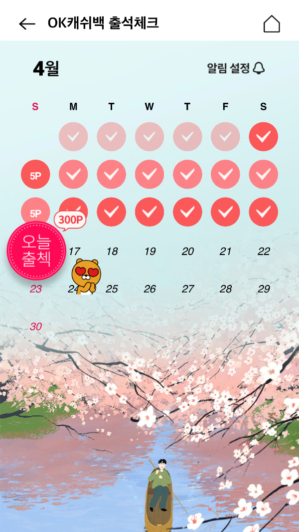 화면이 바뀌면서 캘린더가 나온다. 해당날에 '오늘출첵'을 눌러보면~
