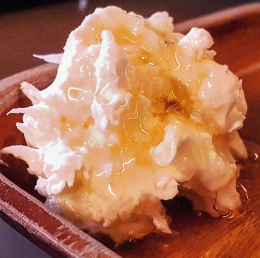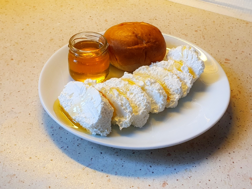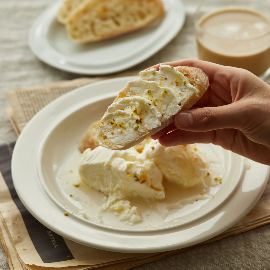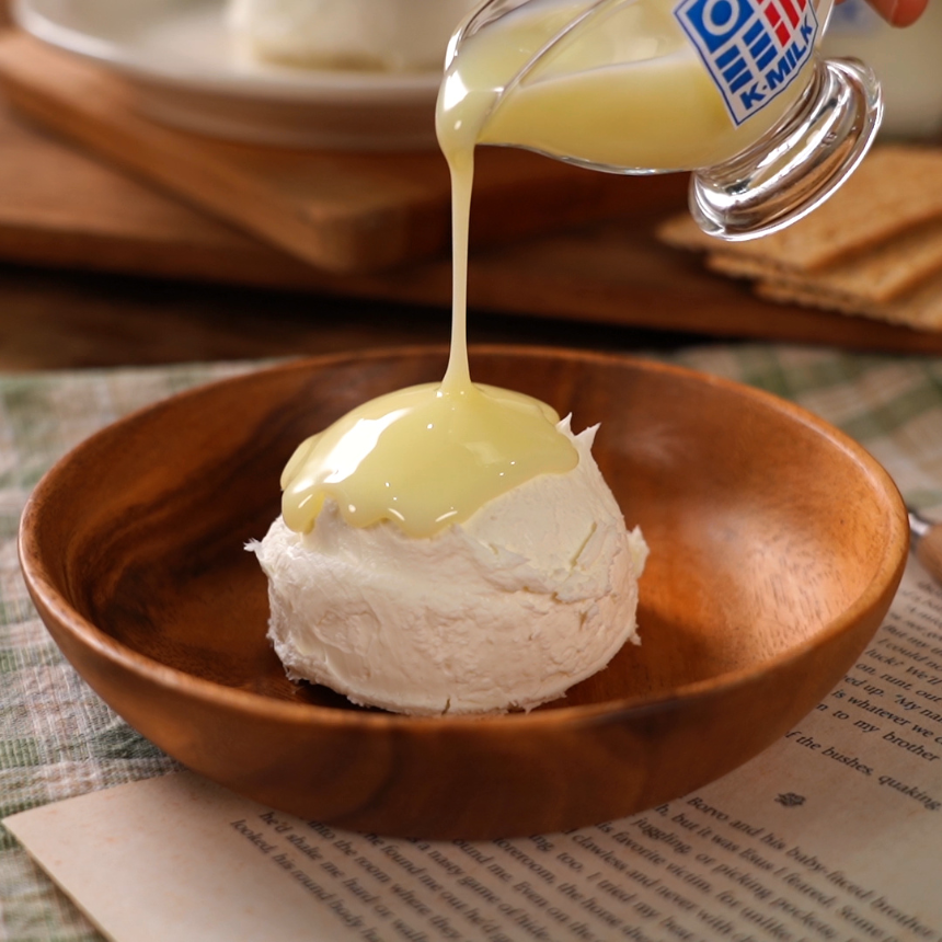 이 크림은 부드러운 질감과 고소한 풍미를 지녀 신선한 빵, 꿀, 잼과 함께 즐기기 좋은 아침 식사 메뉴입니다.