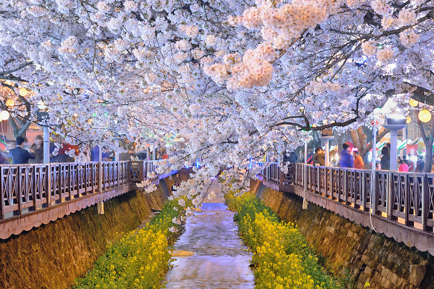 드라마 ‘로망스’ 촬영지로도 유명한 여좌천은, 벚꽃과 조명이 어우러진 야경이 특히 아름다운 곳입니다.