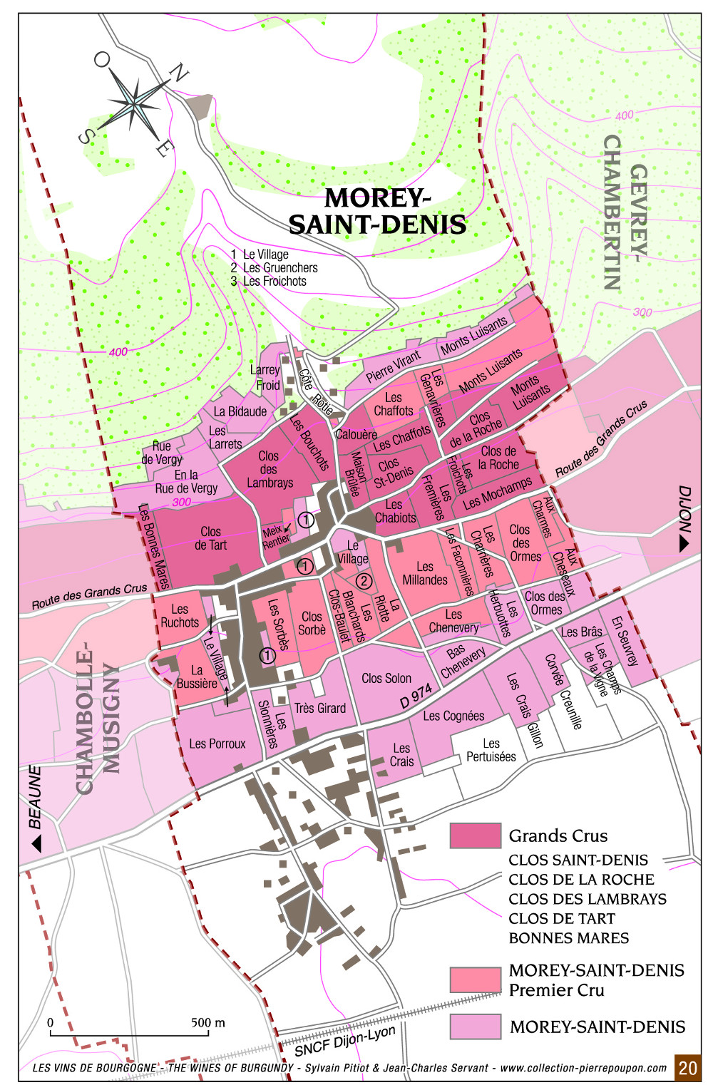 Premiers Crus가 풍부한 모레 생 드니는 5개의 Grands Crus(Clos de Tart, Bonnes Mares, Clos de la Roche, Clos Saint-Denis, Clos des Lambrays)를 자랑한다.