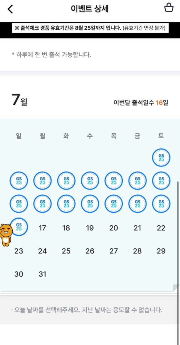 해당일 날짜를 클릭하면 GS25 도장이 찍혀요!!